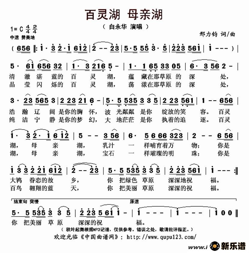 《百灵湖 母亲湖》最新曲谱 白永华-秋叶起舞制谱