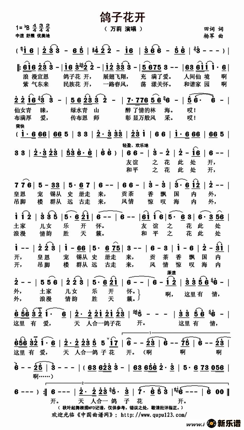 万莉演唱的鸽子花开歌词,鸽子花开最新曲谱.