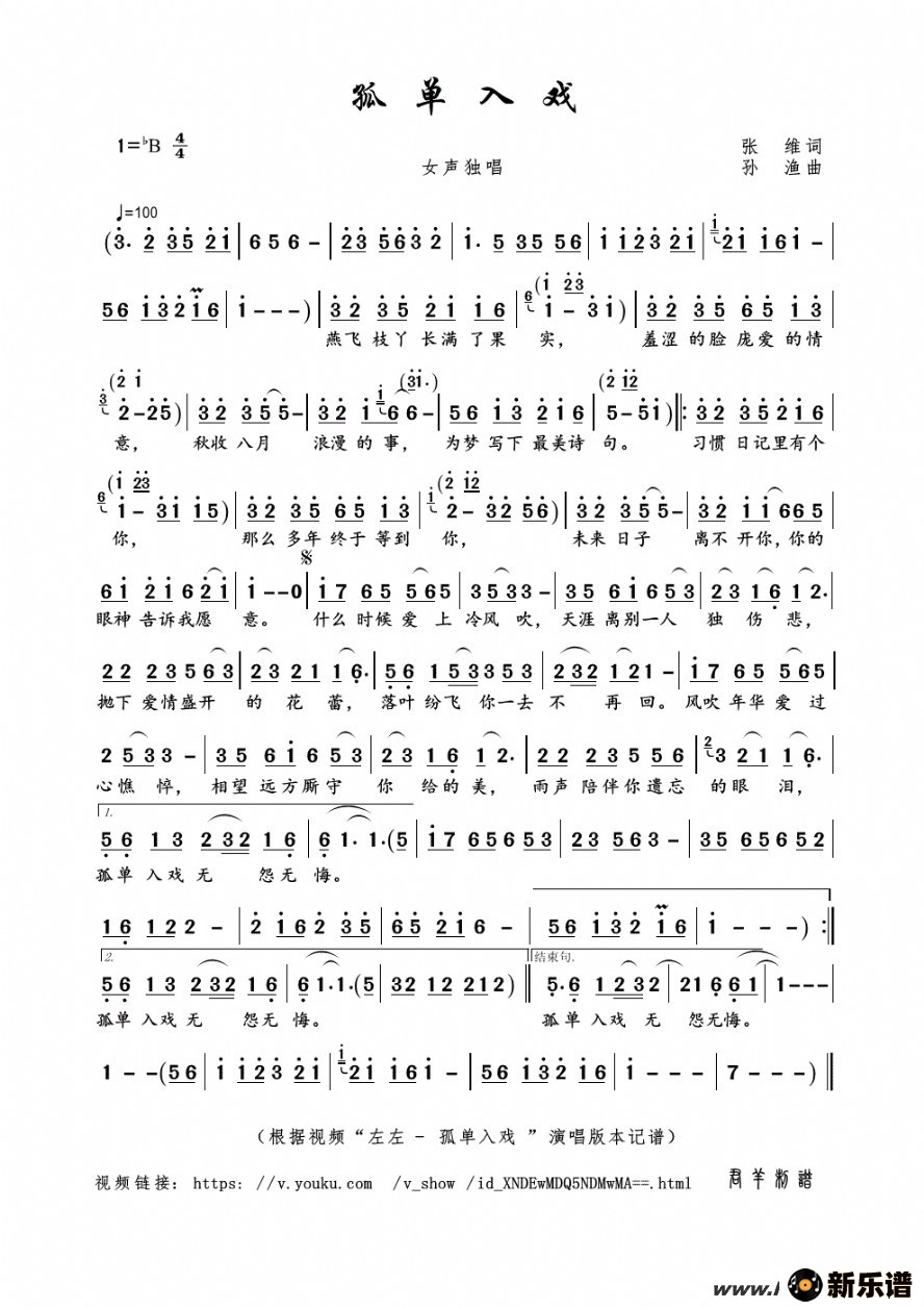 左左演唱的孤单入戏歌词,孤单入戏最新曲谱.