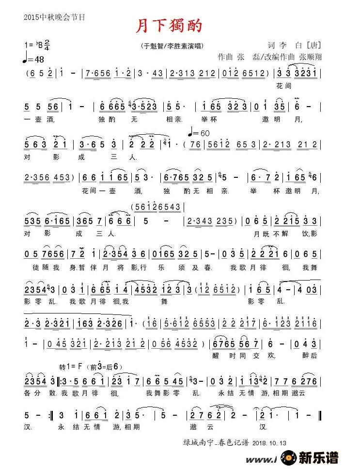 于魁智 李胜素演唱的月下独酌歌词,月下独酌最新曲谱.