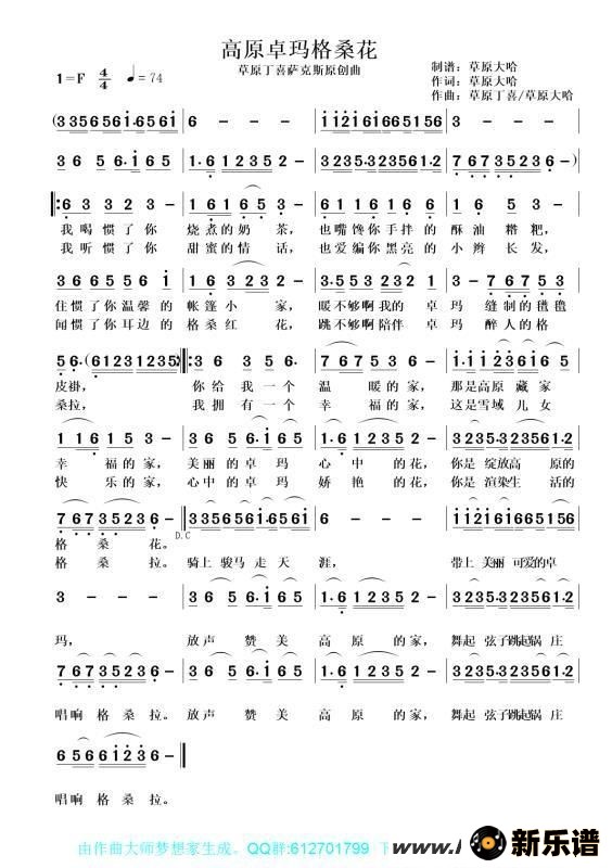 《高原卓玛格桑花》最新曲谱 草原丁喜