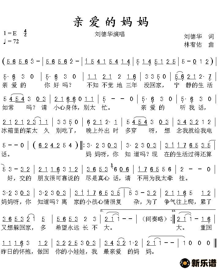 刘德华演唱的亲爱的妈妈歌词,亲爱的妈妈最新曲谱.