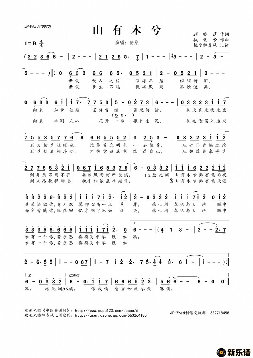 《山有木兮》最新曲谱 伦桑-桃李醉春风制谱