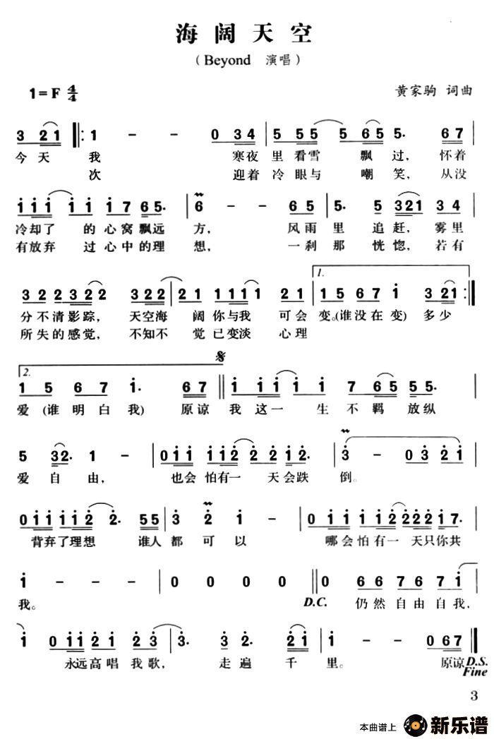 Beyond演唱的海阔天空歌词,海阔天空最新曲谱.