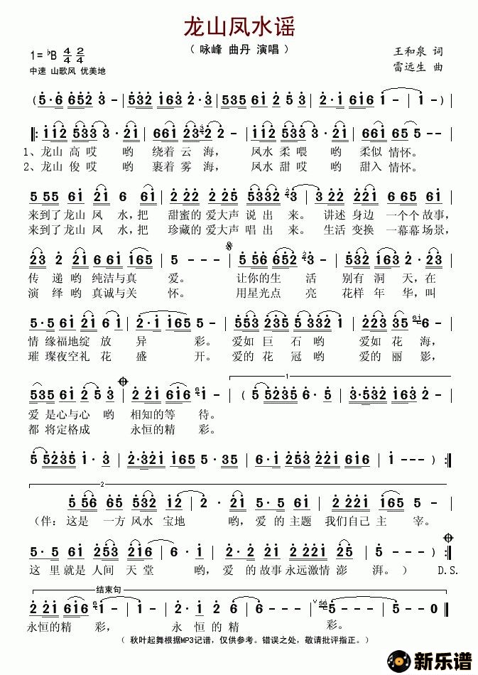曲丹、咏峰演唱的龙山凤水谣歌词,龙山凤水谣最新曲谱.