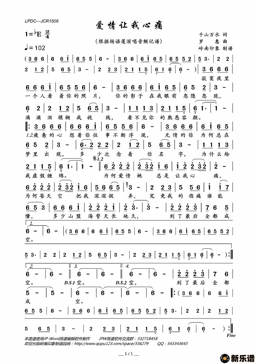 《爱情让我心痛》最新曲谱 杨语莲-岭南印象制谱