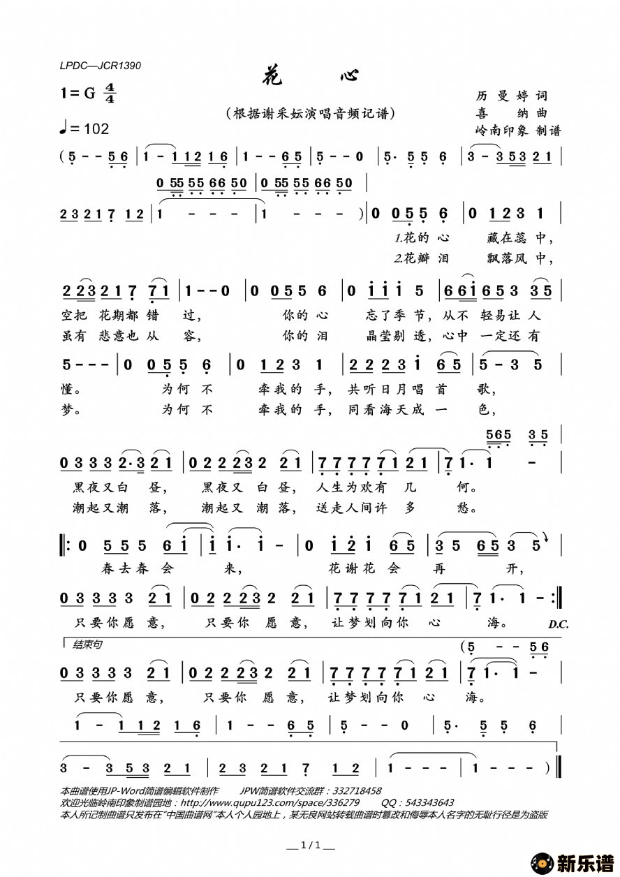《花心》最新曲谱 谢采妘-岭南印象制谱