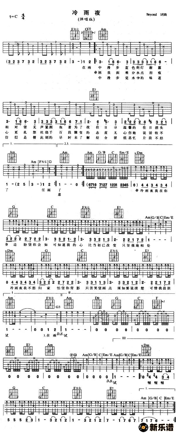 Beyond演唱的冷雨夜歌词,冷雨夜最新曲谱.