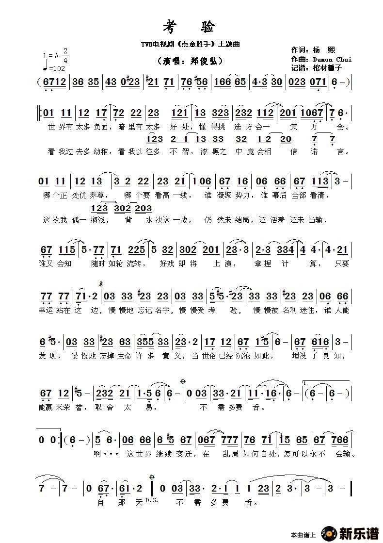 郑俊弘演唱的考验(tvb电视剧《点金胜手》主题曲)歌词,考验(tvb电视剧《点金胜手》主题曲)最新曲谱.