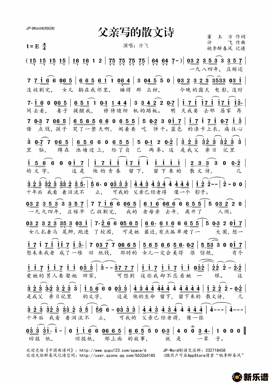 《父亲写的散文诗》最新曲谱 许飞-桃李醉春风制谱