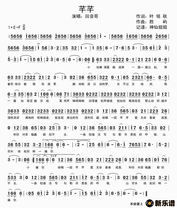 回音哥演唱的芊芊歌词,芊芊最新曲谱.