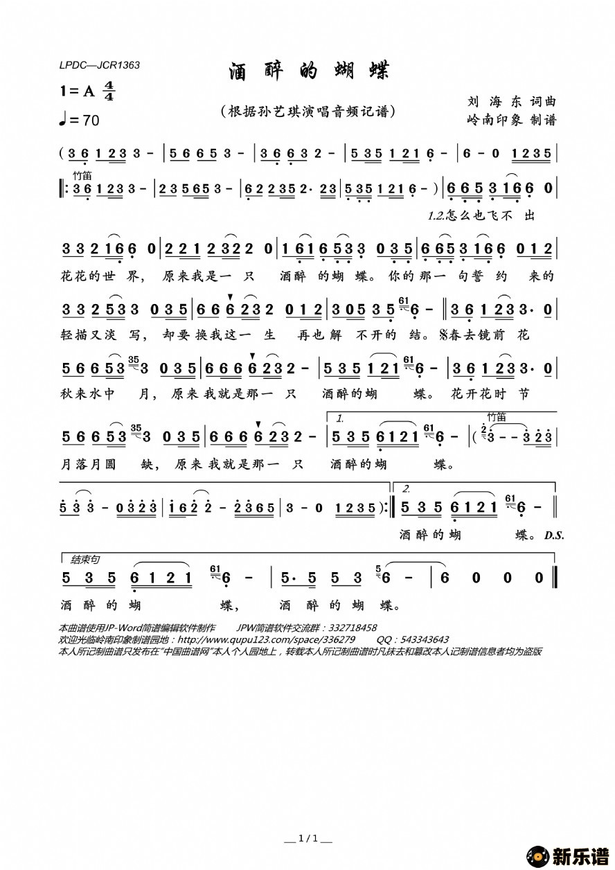 《酒醉的蝴蝶》最新曲谱 孙艺琪-岭南印象制谱