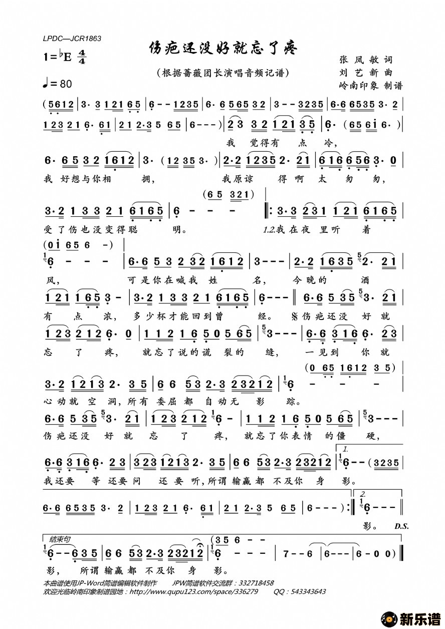 伤疤还没好就忘了疼蔷薇团长 蔷薇团长演唱的伤疤还没好就忘了疼歌词,伤疤还没好就忘了疼最新曲谱. 我觉得有点冷我好想与你相拥我原谅得太匆匆受了伤也没变得聪明我在夜里听着风可是你在喊我姓名今晚的酒有点浓多少杯才能回到曾经伤疤还没好就忘了疼就忘了说的谎裂的缝一见到你就心动就空洞所有委屈都自动无影踪伤疤还没好就忘了疼就忘了你表情的僵硬我还要等还要问还要听所谓输赢都不及你身影我在夜里听着风可是你在喊我姓名今晚的酒有点浓多少杯才能回到曾经伤疤还没好就忘了疼就忘了说的谎裂的缝一见到你就心动就空洞所有委屈都自动无影踪伤疤还没好就忘了疼就忘了你表情的僵硬我还要等还要问还要听所谓输赢都不及你身影伤疤还没好就忘了疼就忘了说的谎裂的缝一见到你就心动就空洞所有委屈都自动无影踪伤疤还没好就忘了疼就忘了你表情的僵硬我还要等还要问还要听所谓输赢都不及你身影所谓输赢都不及你身影 此最新曲谱由新乐谱会员 岭南印象 上传