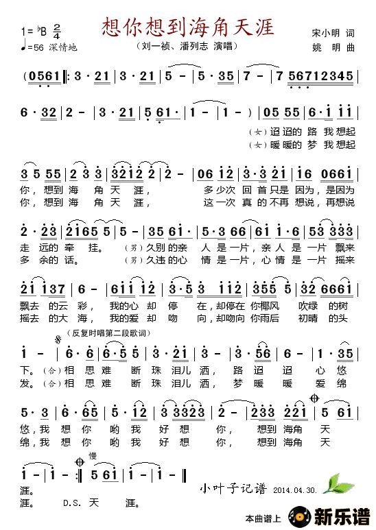 《想你想到海角天涯》最新曲谱 刘一祯/潘列志