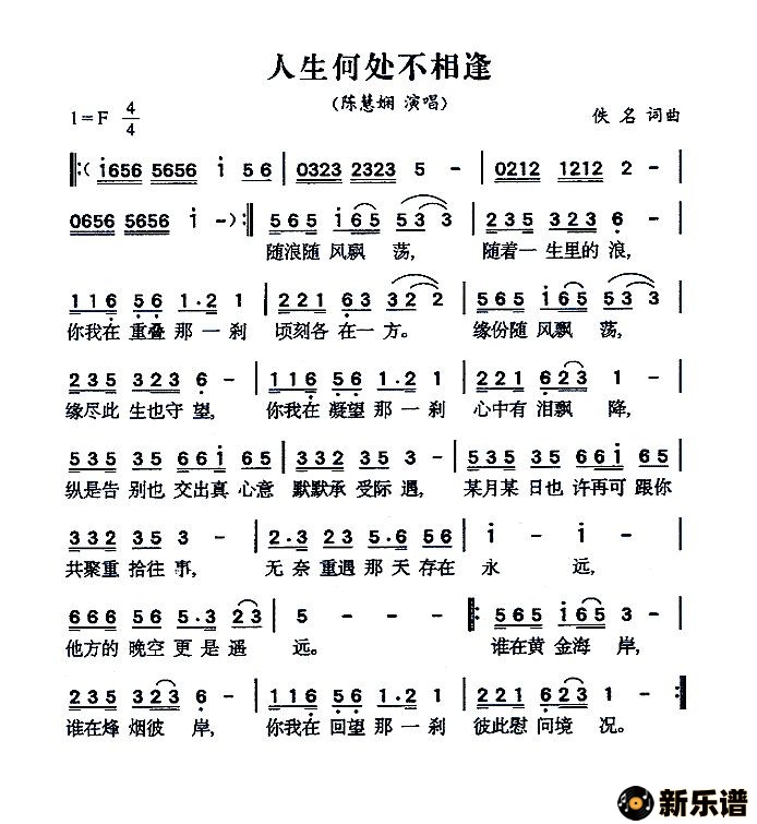 陈慧娴演唱的人生何处不相逢歌词,人生何处不相逢最新曲谱.