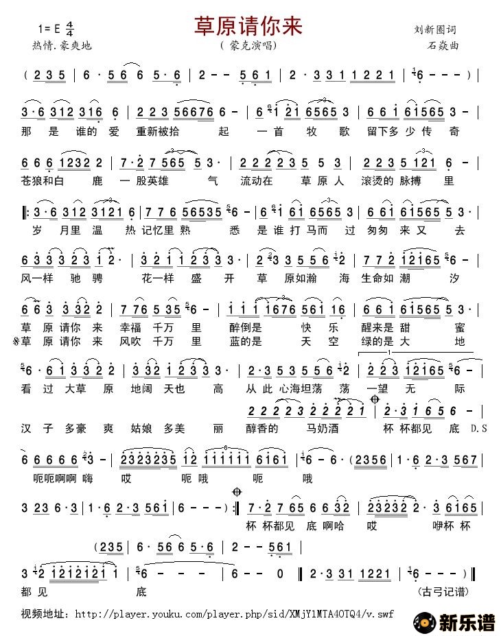 蒙克演唱的草原请你来歌词,草原请你来最新曲谱.