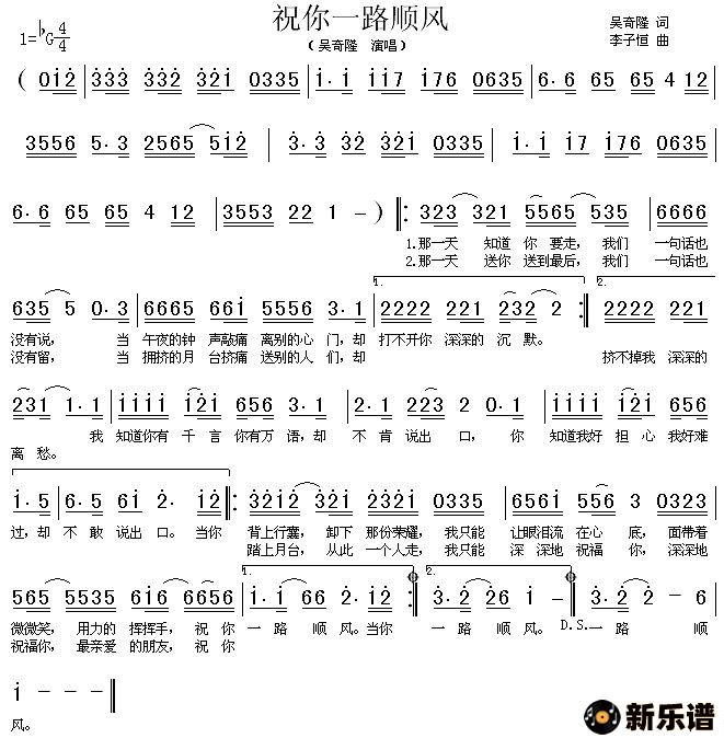吴奇隆演唱的祝你一路顺风歌词,祝你一路顺风最新曲谱.