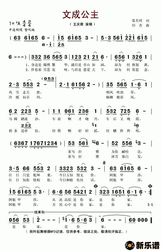 王庆爽演唱的文成公主歌词,文成公主最新曲谱.