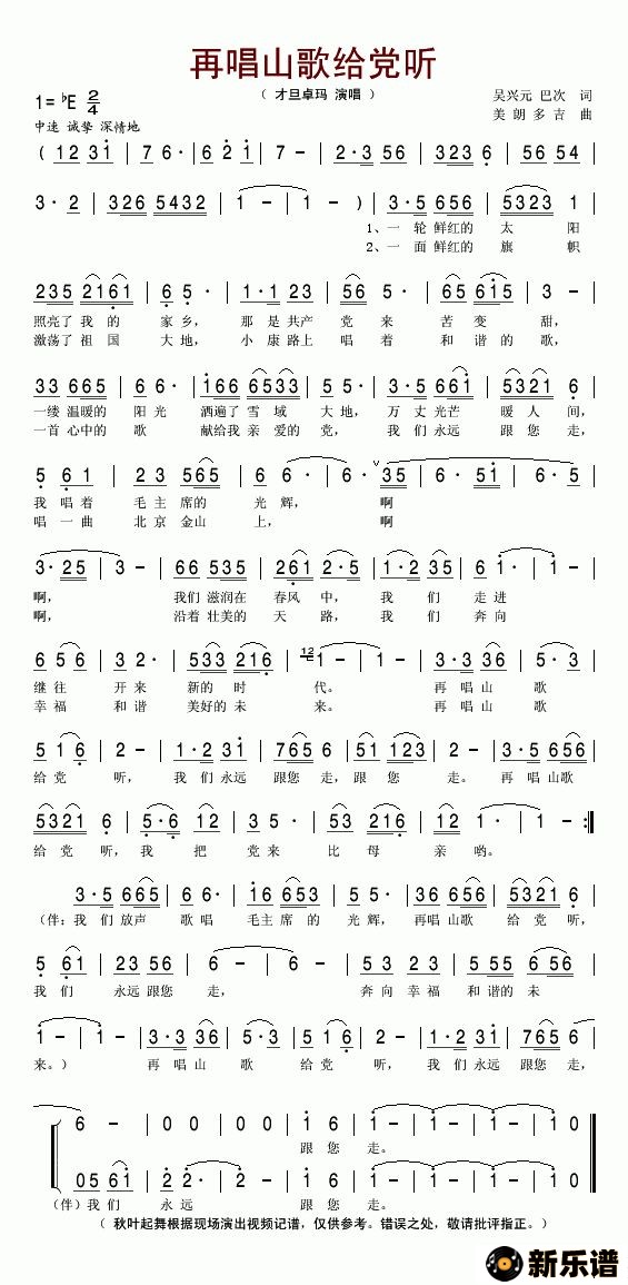 《再唱山歌给党听》最新曲谱 才旦卓玛