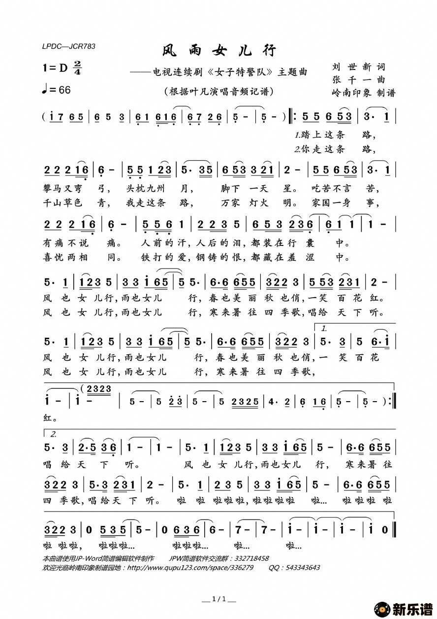 风雨女儿行(电视连续剧《女子特警队》主题曲)叶凡 叶凡演唱的风雨女儿行(电视连续剧《女子特警队》主题曲)歌词,风雨女儿行(电视连续剧《女子特警队》主题曲)最新曲谱. 此最新曲谱由新乐谱会员 岭南印象 上传