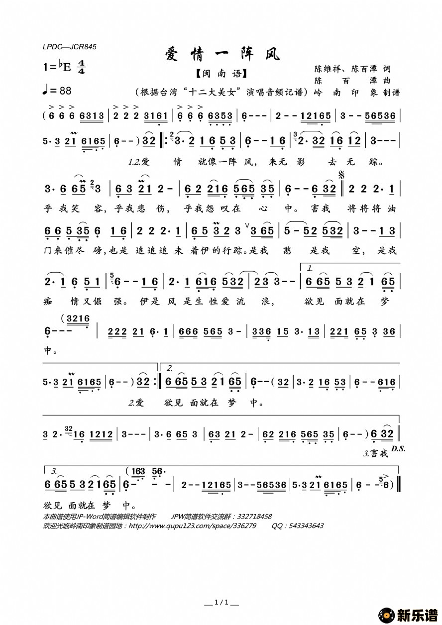 《爱情一阵风》最新曲谱 台湾“十二大美女”-岭南印象制谱