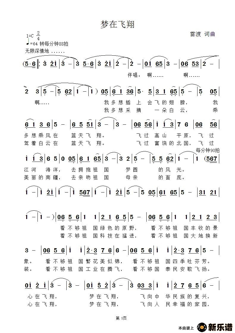 李敏演唱的梦在飞翔歌词,梦在飞翔最新曲谱.