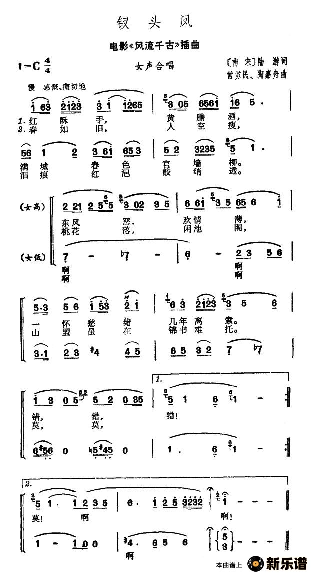 > 钗头凤(电影《风流千古》插曲)最新曲谱