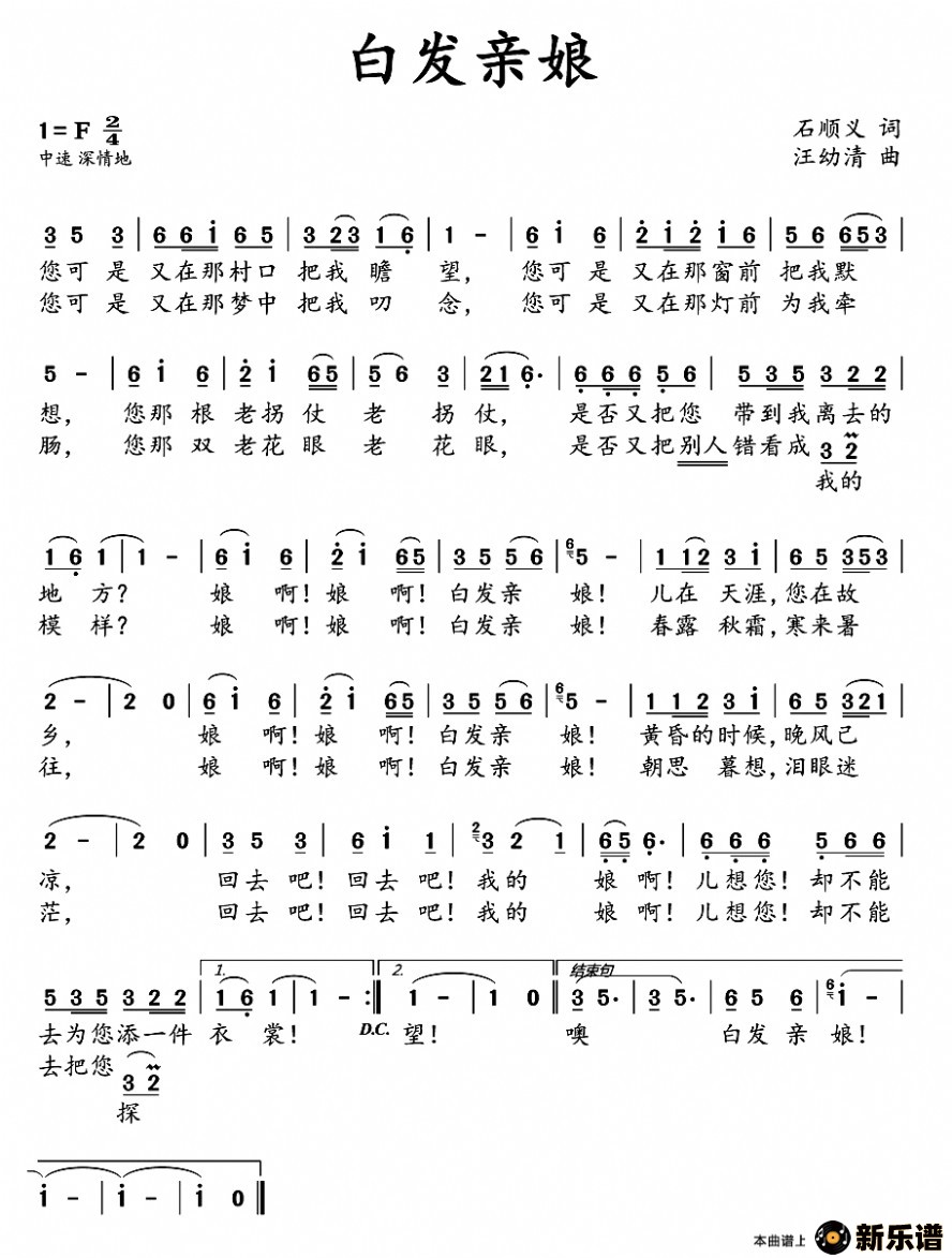 演唱的白发亲娘歌词,白发亲娘最新曲谱.