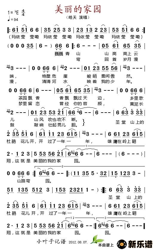 皓天演唱的美丽的家园歌词,美丽的家园最新曲谱.