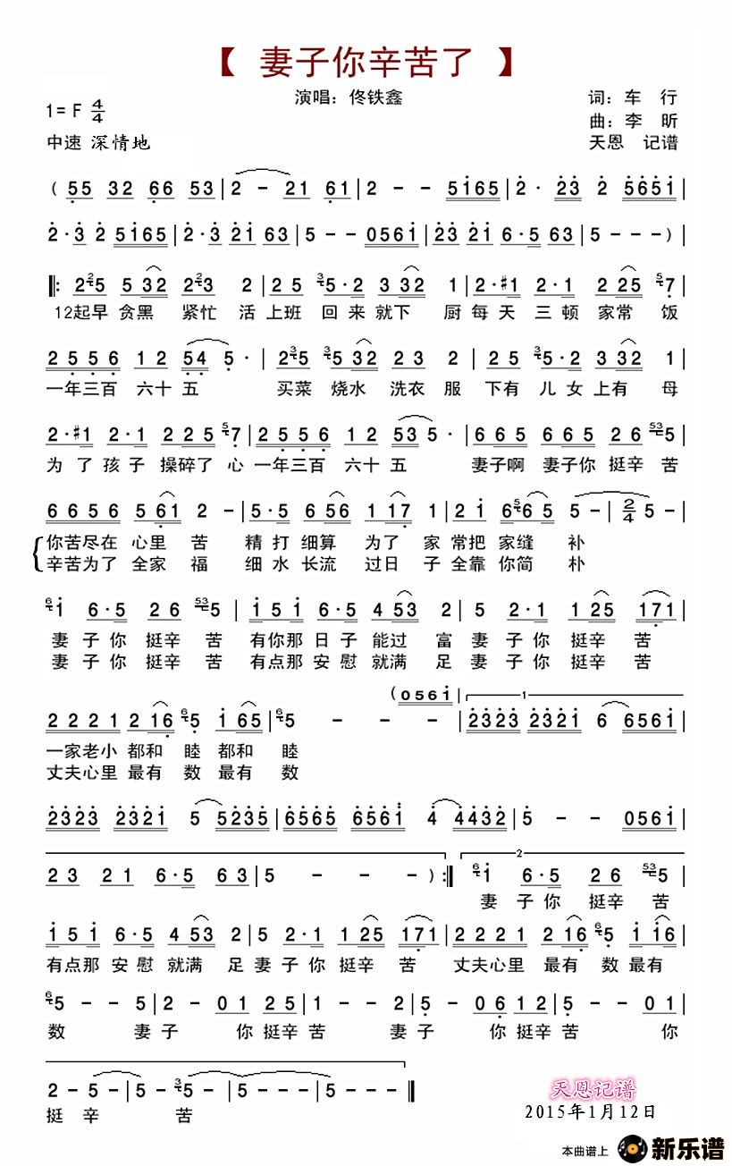 《妻子你辛苦了》最新曲谱 佟铁鑫-天恩制谱