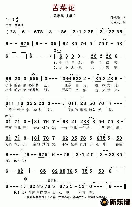 陈惠英演唱的苦菜花歌词,苦菜花最新曲谱.