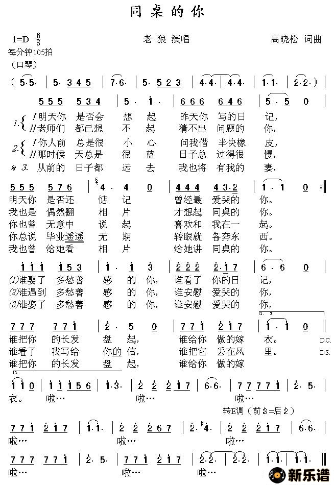 老狼演唱的同桌的你歌词,同桌的你最新曲谱.