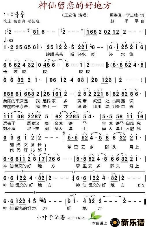 王宏伟演唱的神仙留恋的好地方歌词,神仙留恋的好地方最新曲谱.