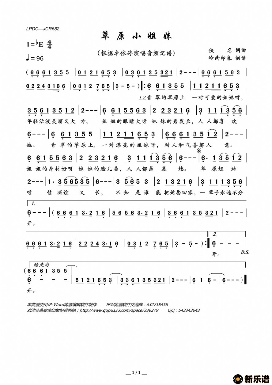 《草原小姐妹》最新曲谱 卓依婷-岭南印象制谱