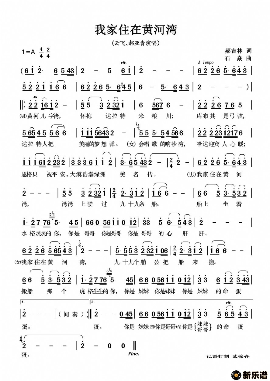 云飞、郝亚青演唱的我家住在黄河湾歌词,我家住在黄河湾最新曲谱.
