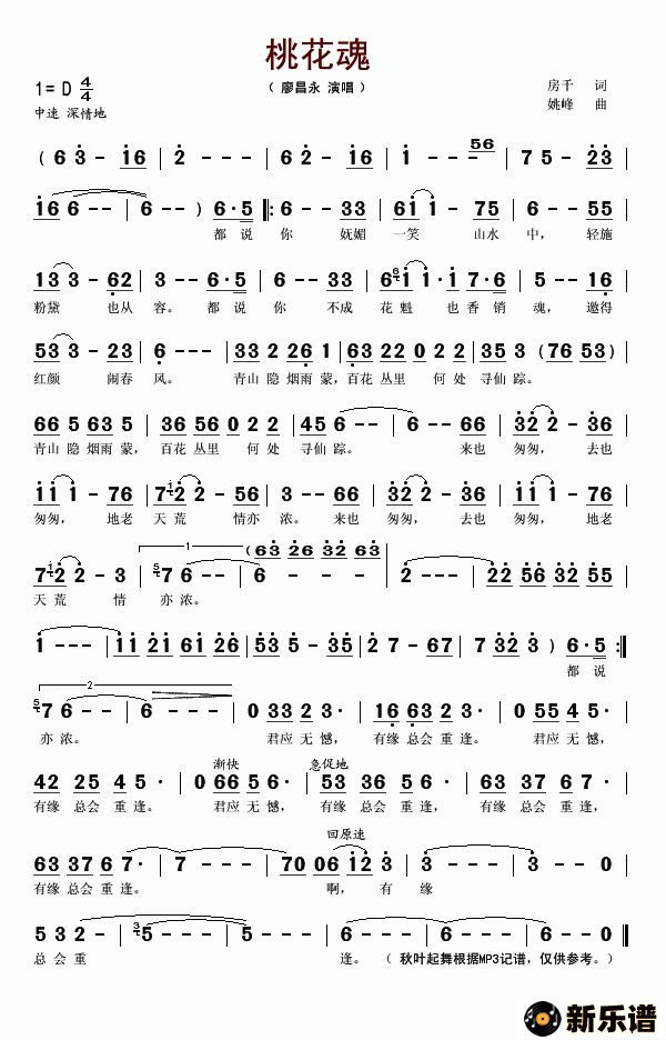廖昌永演唱的桃花魂歌词,桃花魂最新曲谱.
