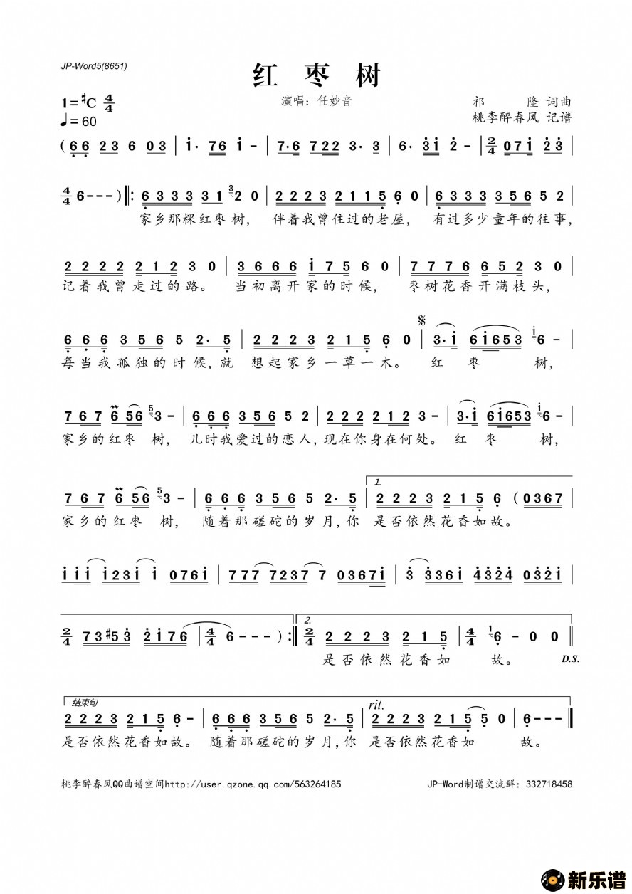 任妙音演唱的红枣树歌词,红枣树最新曲谱.