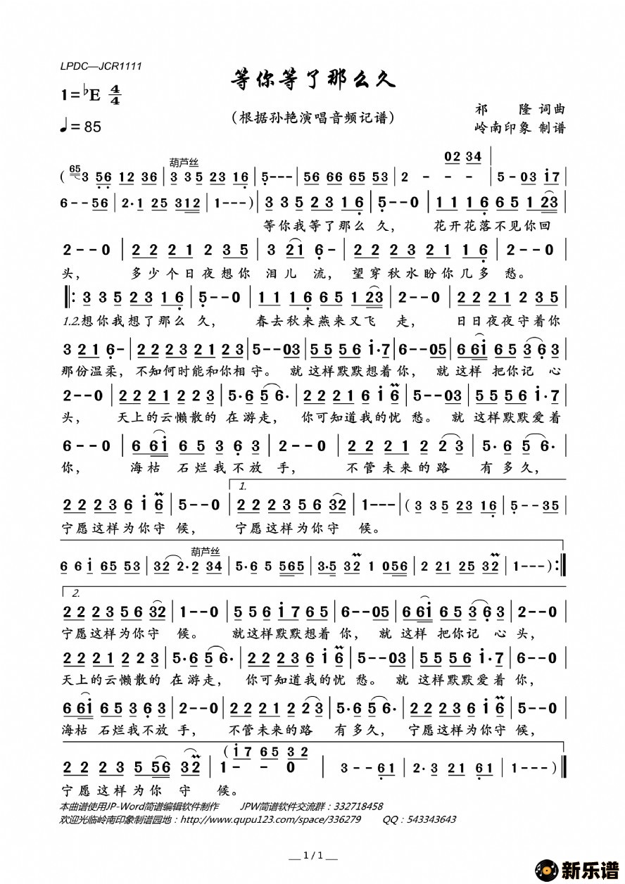 《等你等了那么久》最新曲谱 孙艳-岭南印象制谱