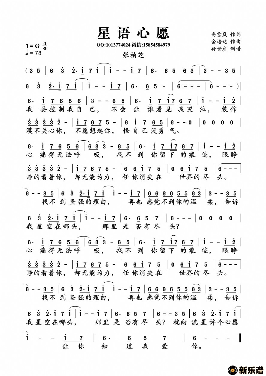 张柏芝演唱的星语心愿歌词,星语心愿最新曲谱.