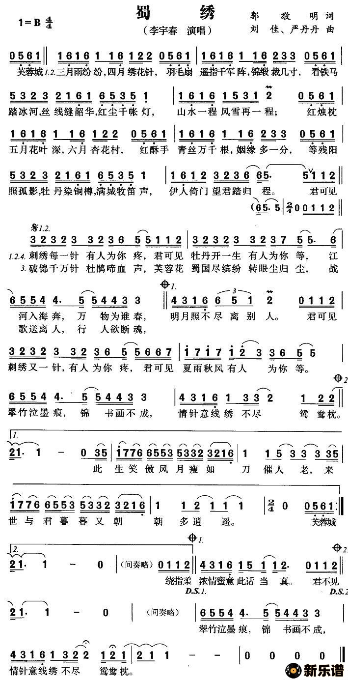 李宇春演唱的蜀绣歌词,蜀绣最新曲谱.