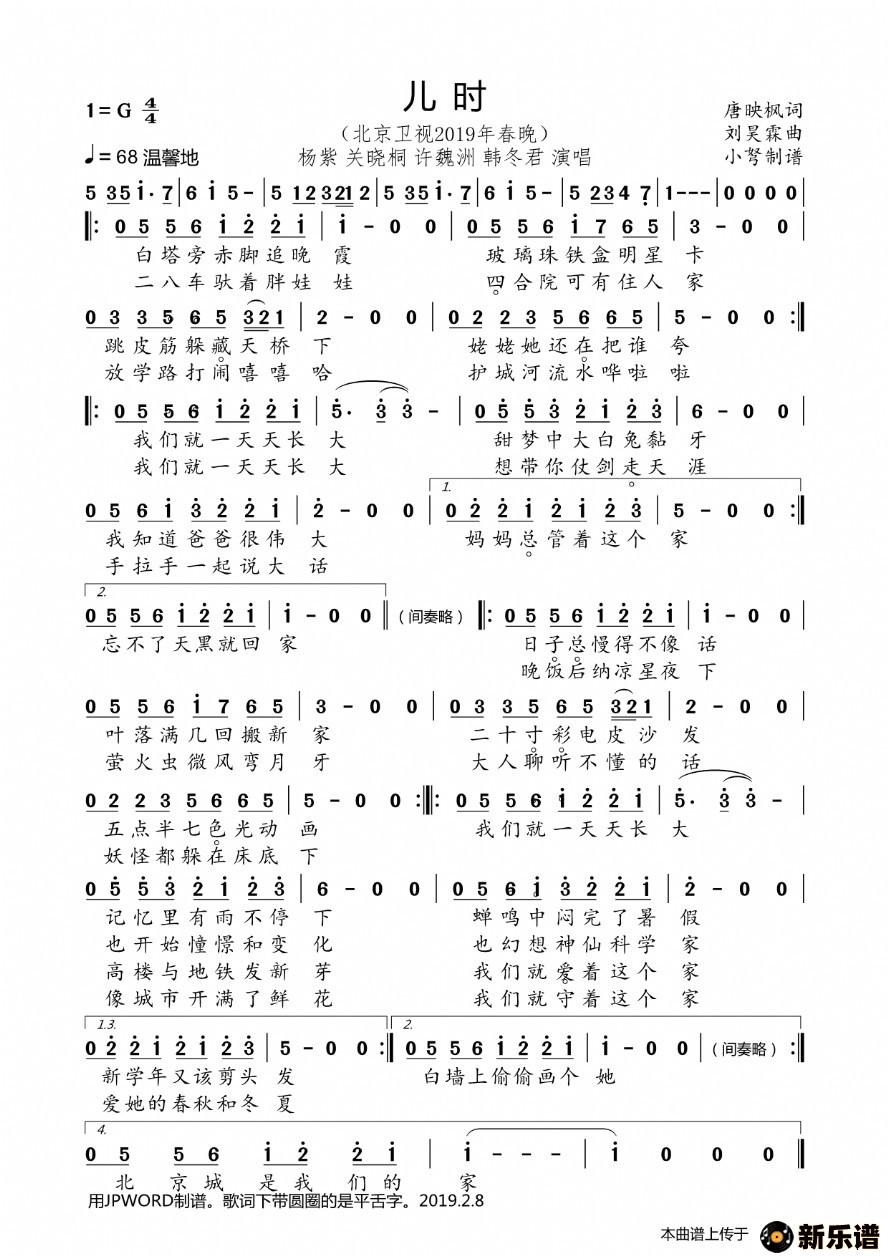 杨紫 关晓桐 许魏洲 韩冬君演唱的儿时歌词,儿时最新曲谱.