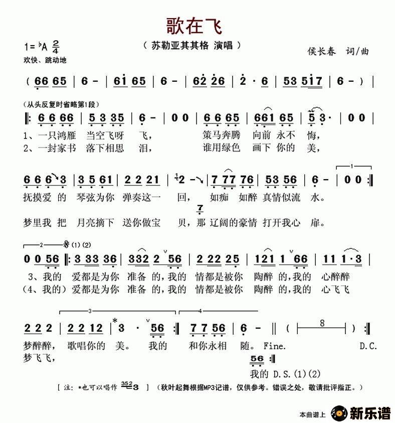 苏勒亚其其格演唱的歌在飞歌词,歌在飞最新曲谱.