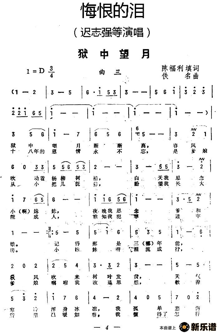 狱中望月/迟志强 悔恨的泪 相关曲谱