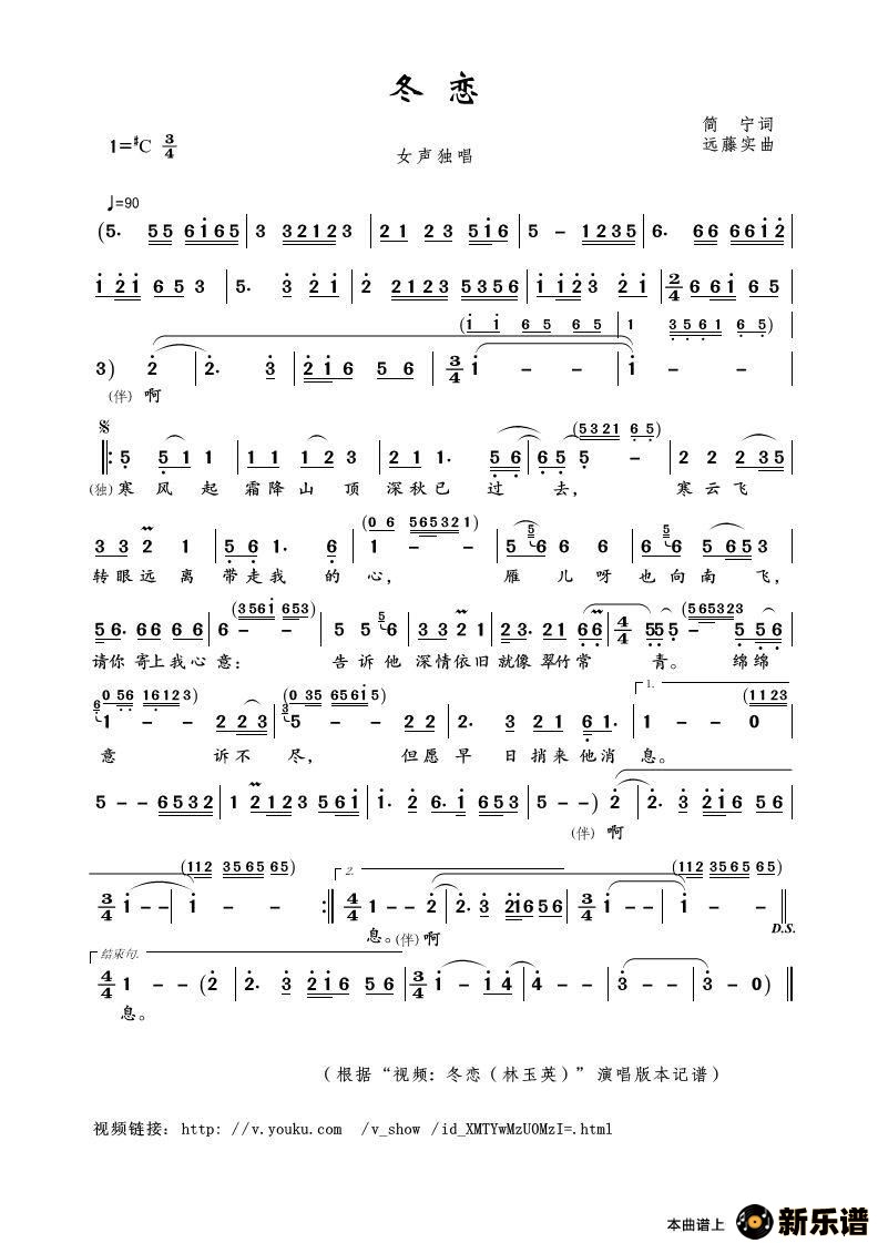林玉英演唱的冬恋歌词,冬恋最新曲谱.