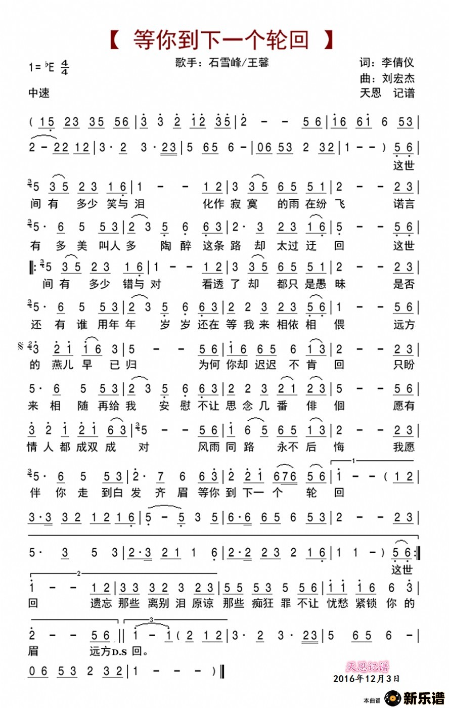《等你到下一个轮回》最新曲谱 石雪峰/王馨-天恩制谱