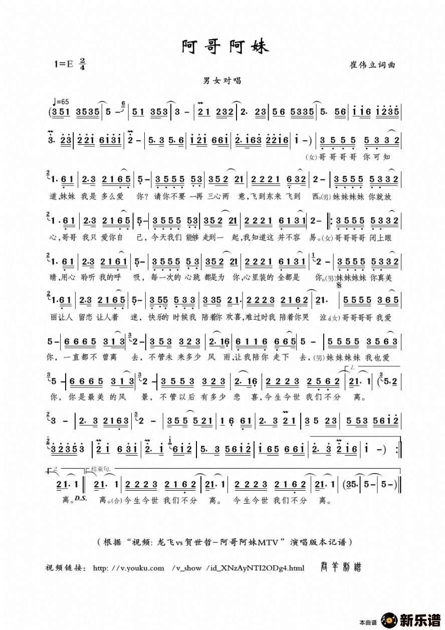 《阿哥阿妹》最新曲谱 龙飞、贺世哲-君羊制谱