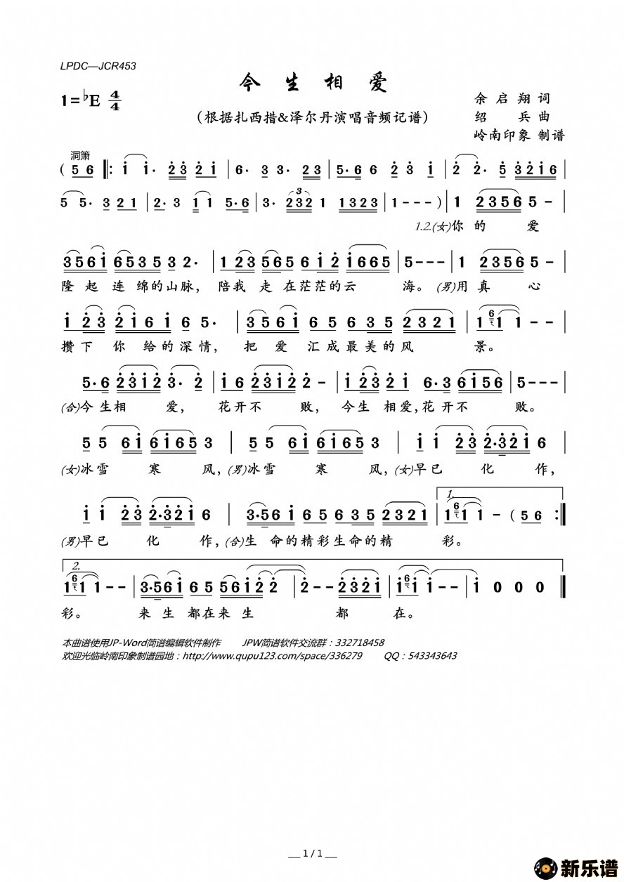 《今生相爱》最新曲谱 扎西措&泽尔丹-岭南印象制谱