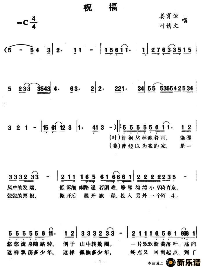姜育恒、叶倩文演唱的祝福歌词,祝福最新曲谱.
