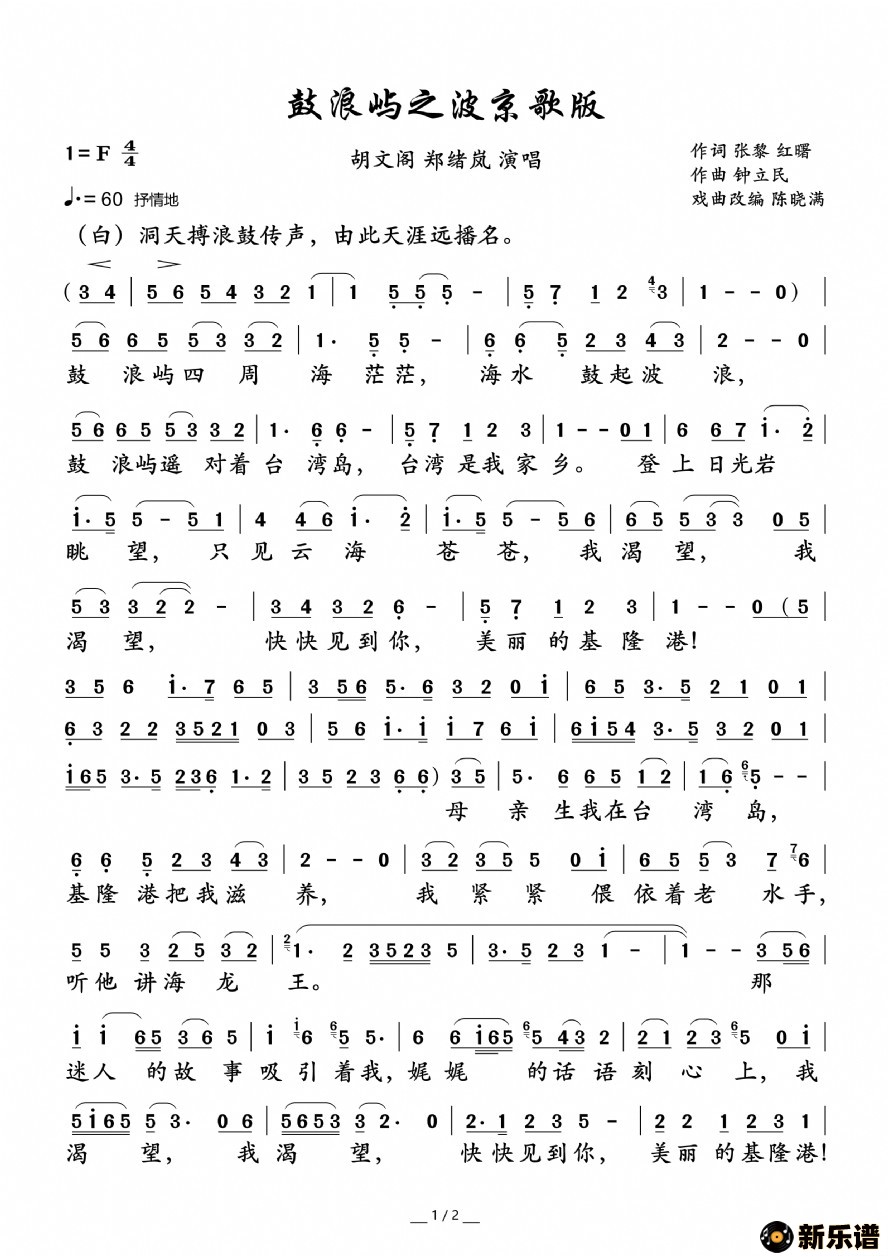 胡文阁 郑绪岚演唱的鼓浪屿之波京歌版歌词,鼓浪屿之波京歌版最新曲谱.