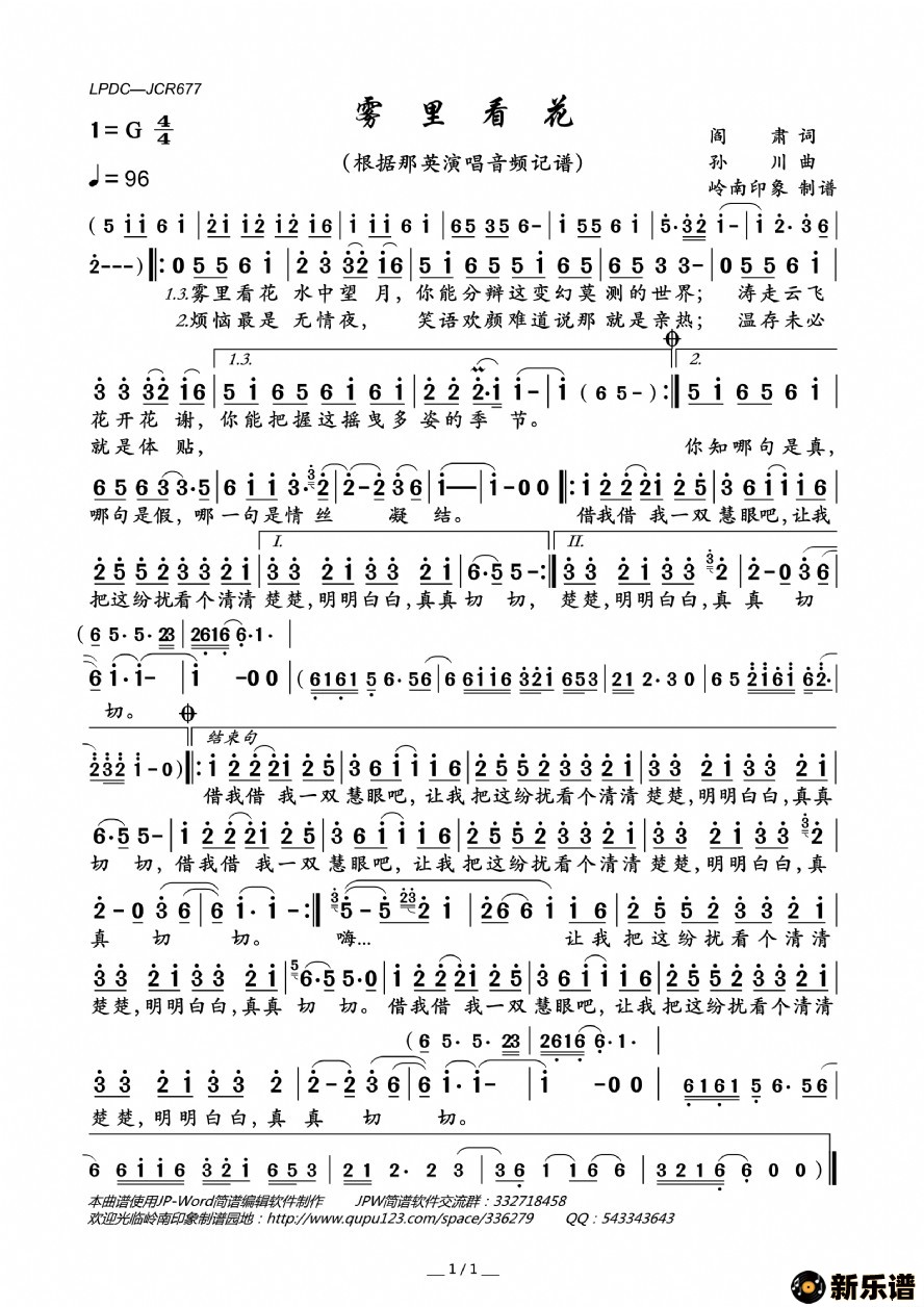 《雾里看花》最新曲谱 那英-岭南印象制谱